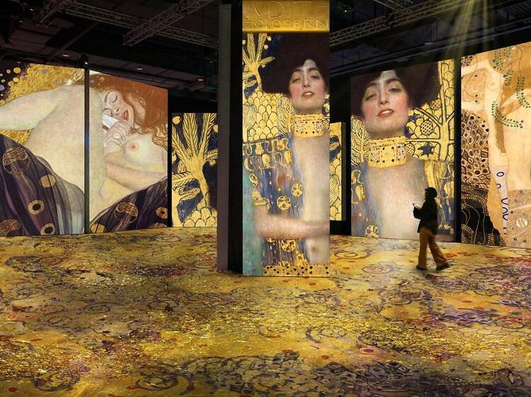 会場では、高さ7メートルの空間に巨大スクリーンを設置。光・色・音・香りの中で、『接吻』『ユディト』『死と⽣』をはじめとするクリムトの傑作の数々が、空間全体に次々と映し出される。