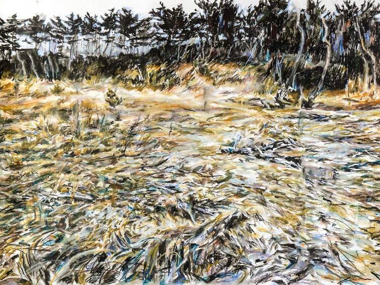 本展では、東日本大震災の津波の後に残った宮城県沿岸部の松林を継続的に観察しながら描いたシリーズや、当時の地震による崖崩れを覆うブルーシートが今も残る風景を描いた作品群を展示。作品は、時間の経過の痕跡、目の前の風景の現れから見えてくる社会や人間とのつながりについて描いている。