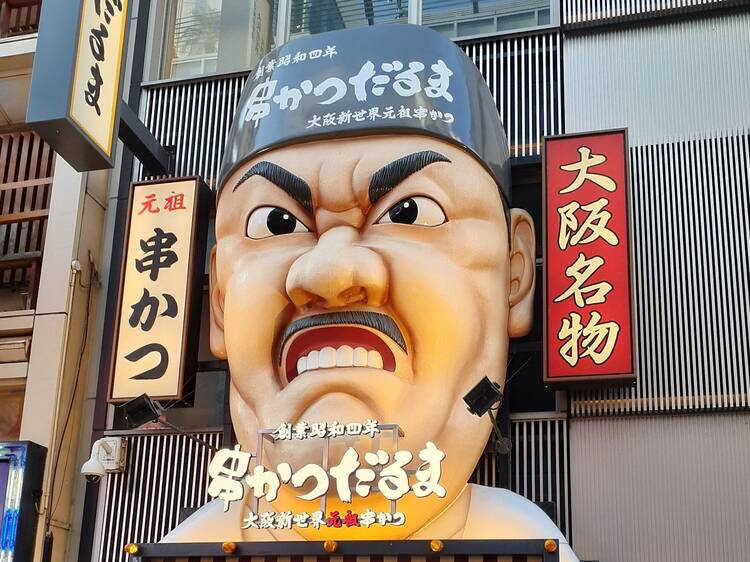 1929年に新世界で誕生した、大阪を代表する串カツ店「大阪新世界元祖串かつ だるま 道頓堀店」。大阪市内に複数店舗を構え、道頓堀店は戎橋のほど近くにある。インパクトのある大きな「だるま大臣」の看板が目印だ。