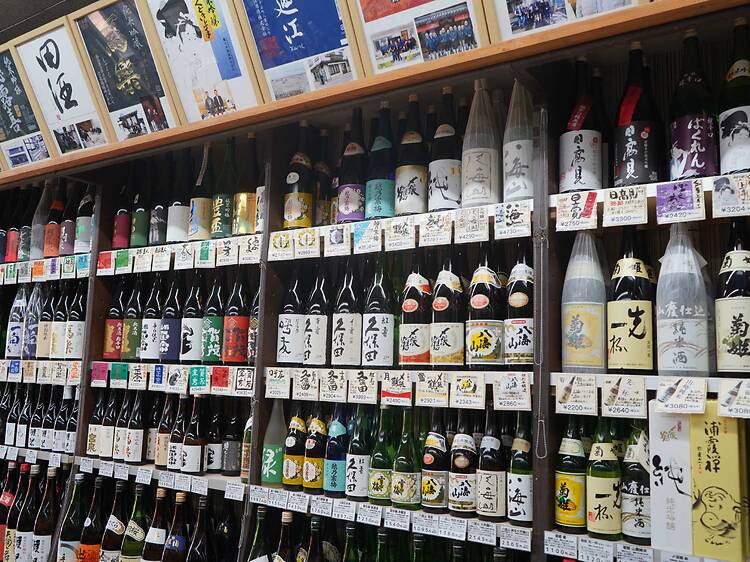鶴川団地センター名店街にある酒屋。店内に立ち入ると、壁一面にずらりと並ぶ酒瓶に圧倒され、ここがただの酒屋ではないことが分かるだろう。焼酎と日本酒の種類が豊富で、倉庫も含めると計約500種類も用意する。
