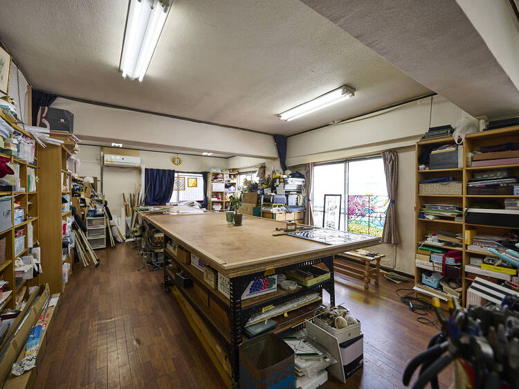 「ヴィラ内川」の303号室にある、30年の歴史があるステンドグラス工房。住宅や施設の窓用ステンドグラスをオーダー制作しているほか、ステンドグラス制作教室を開いている。レッスンは、特定の課題を設けず、各自の作りたいものを相談しながら決めるスタイルだ。