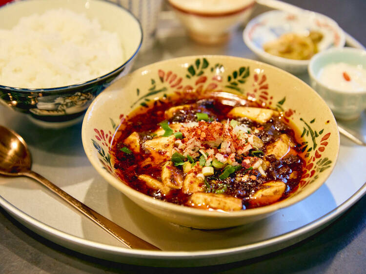 麻婆豆腐が絶大な人気を集める「かかん鎌倉本店」の姉妹店。代々木公園のほど近くにあり、テラス席では愛犬と同伴できる。