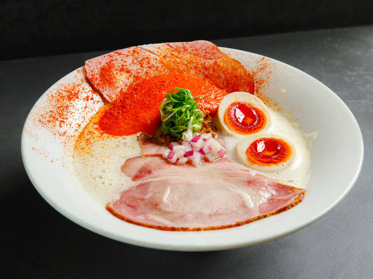 おすすめは「特上 鶏白湯らぁ麺」(1,700円、以下全て税込み)。豚ロースのスモークチャーシューや豚肩ロースのチャーシュー、九条ネギ、フライドオニオンのほか、パプリカを使ったエスプーマが付く。オレンジと白というフランス料理を思わせるような美しさとしっかりとした食べ応えが両立している洗練された一杯。東京で進化した鶏白湯ラーメンの一つの完成形と言えよう。