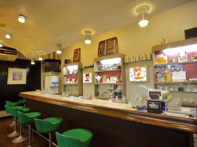 「船場センタービル」がオープンした1970年から営業を続けているコーヒー専門店。店のしつらえは基本的に当時のものが引き継がれ、「レトロモダン」な雰囲気に浸りながらコーヒーを味わえるのが魅力の一つである。店でひときわ目を引くのは、看板や窓に貼られた赤い服を着た女の子だ。