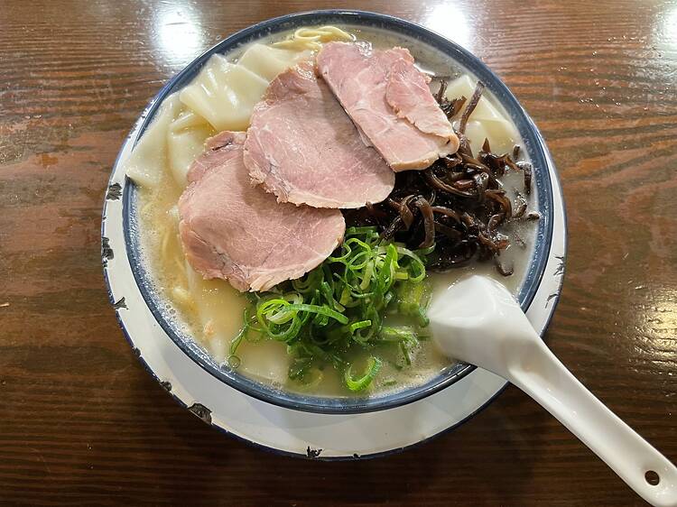 店内で36時間炊き上げるという豚骨スープはクリーミーな白濁色で、こくがあるのに意外にもあっさりとしたおいしさが口内に広がる。麺は、福岡県朝倉産の小麦をベースにした厳選素材で作るストレート細麺。もちろん麺の固さを選べて、店の薦めは固めだ。