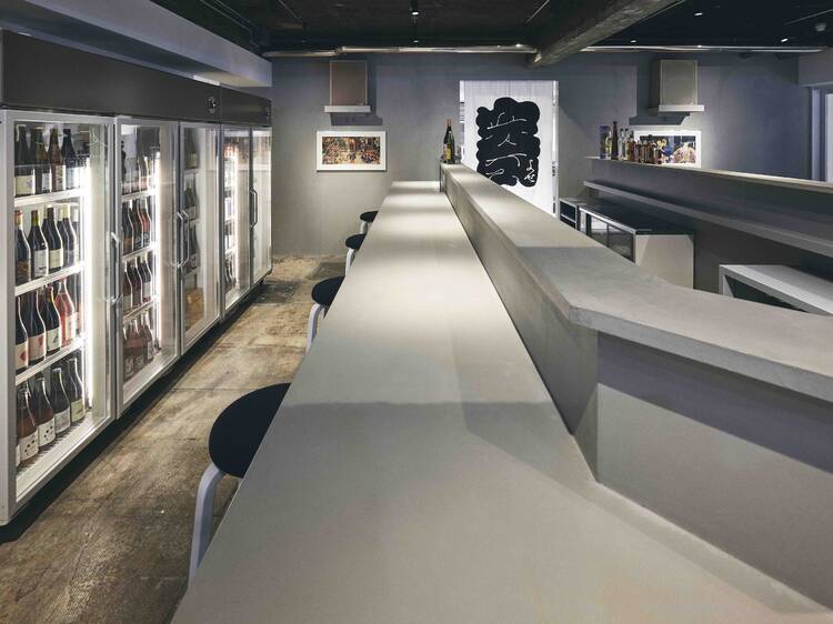 参宮橋エリアに佇む、立ち飲み居酒屋「寄(よせ)」。店内のグレーを基調とした無機質な佇まいが印象的だ。「寄せ」のロゴがインパクトのある暖簾(のれん)を正面に、大きなコの字型のカウンターで角打ちスタイルで食事が楽しめる。