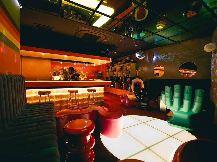 内装のコンセプトは「1970年代のニューヨーク」で、当時の空気感を想像し仕上げた。ビタミンカラーを貴重としたビビッドな色使いとスペースエイジの時代を彷彿(ほうふつ)とさせるバーカウンター、そしてレトロなコーデュロイのソファをはじめとするインテリアが目に飛び込んでくる。