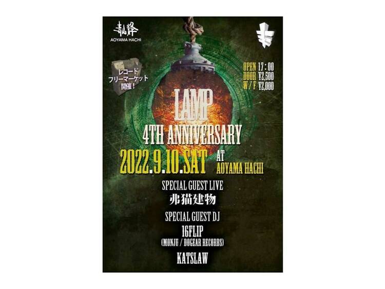 レコードディガーやブラックミュージックラバーによるヒップホップパーティー「LAMP」の4周年アニバーサリーが、「青山蜂」で開催。スペシャルゲストして登場する弗猫建物によるライブや、16FLIP(MONJU/DOGEAR RECORDS)とKATSLAWによるDJに期待が高まる。
