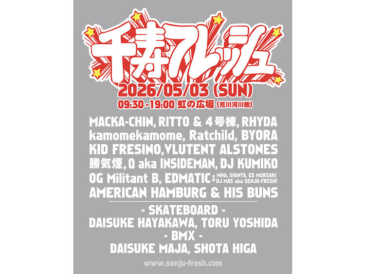 東京・北千住のストリートシーンのつながりから生まれた新たなカルチャーフェスティバル「千寿フレッシュ」が、荒川河川敷の「虹の広場」で開催。千住の街で出会い・つながった仲間たちによって実施される。