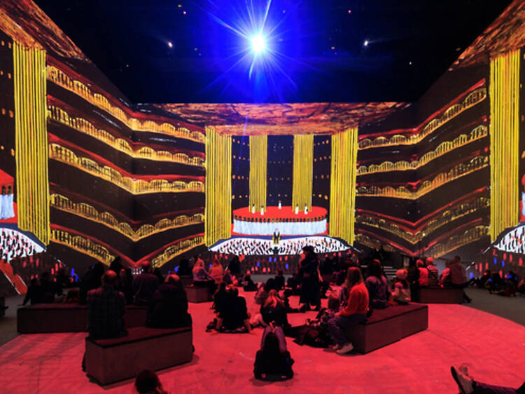 ホックニーのキャリアの中でもあまり掘り下げられてこなかったこの時期に光を当てるべく、タービン ホールは壮大で没入感あふれるオペラ体験の場へと変貌し、これらの舞台美術が象徴的な空間の壁面に投影される。テートによれば、来場者に「音楽とアートが動きの中で交差する、スリリングな体験」が楽しめるという。