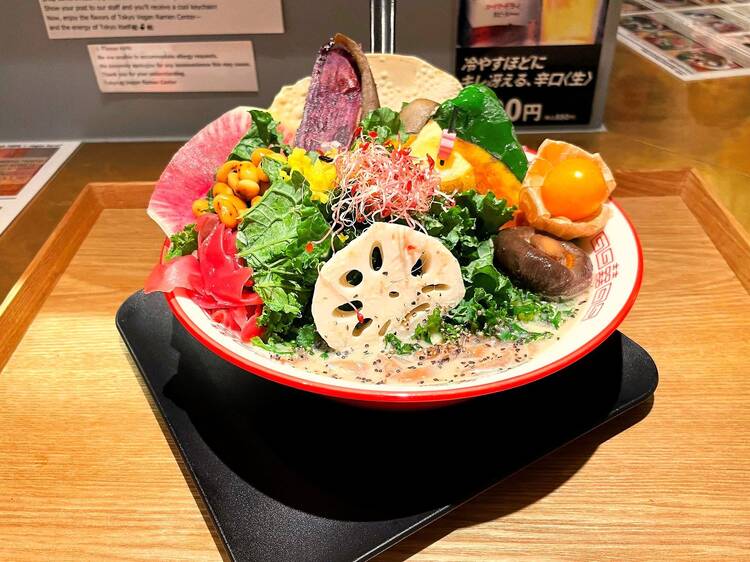 「東京ラーメンストリート」に店を構える「そらのいろ NIPPON」。「醤油らーめん」や「キノコベジソバ」のほか、玄米の麺を使ったグルテンフリーの「塩らーめん」を提供する。トマトやブロッコリーなどの季節の野菜や鶏肉のスライス、とろとろ卵がトッピングされている。