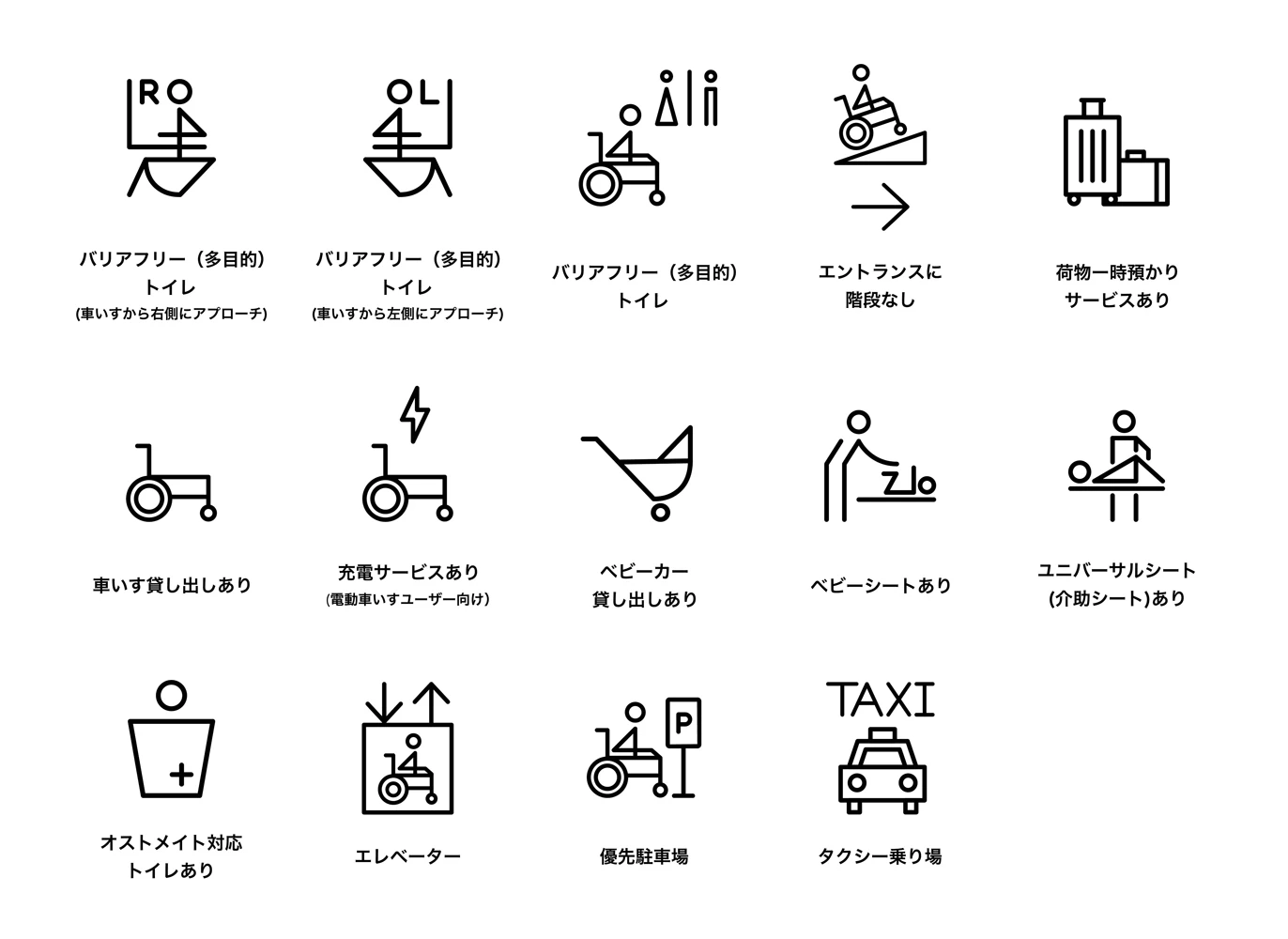 レストランやショップ、バーなど、各ヴェニューの紹介部分にはピクトグラムを掲載。バリアフリートイレ、ベビーシート、入り口における段差の有無などが一目で分かるようになっている。