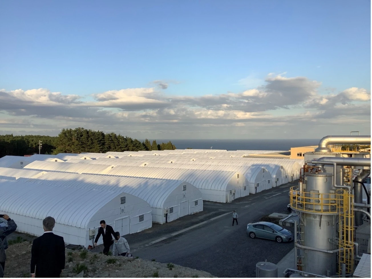久慈バイオマスエネルギーによる菌床シイタケ栽培プラントと熱供給プラント(右)撮影:北村和也