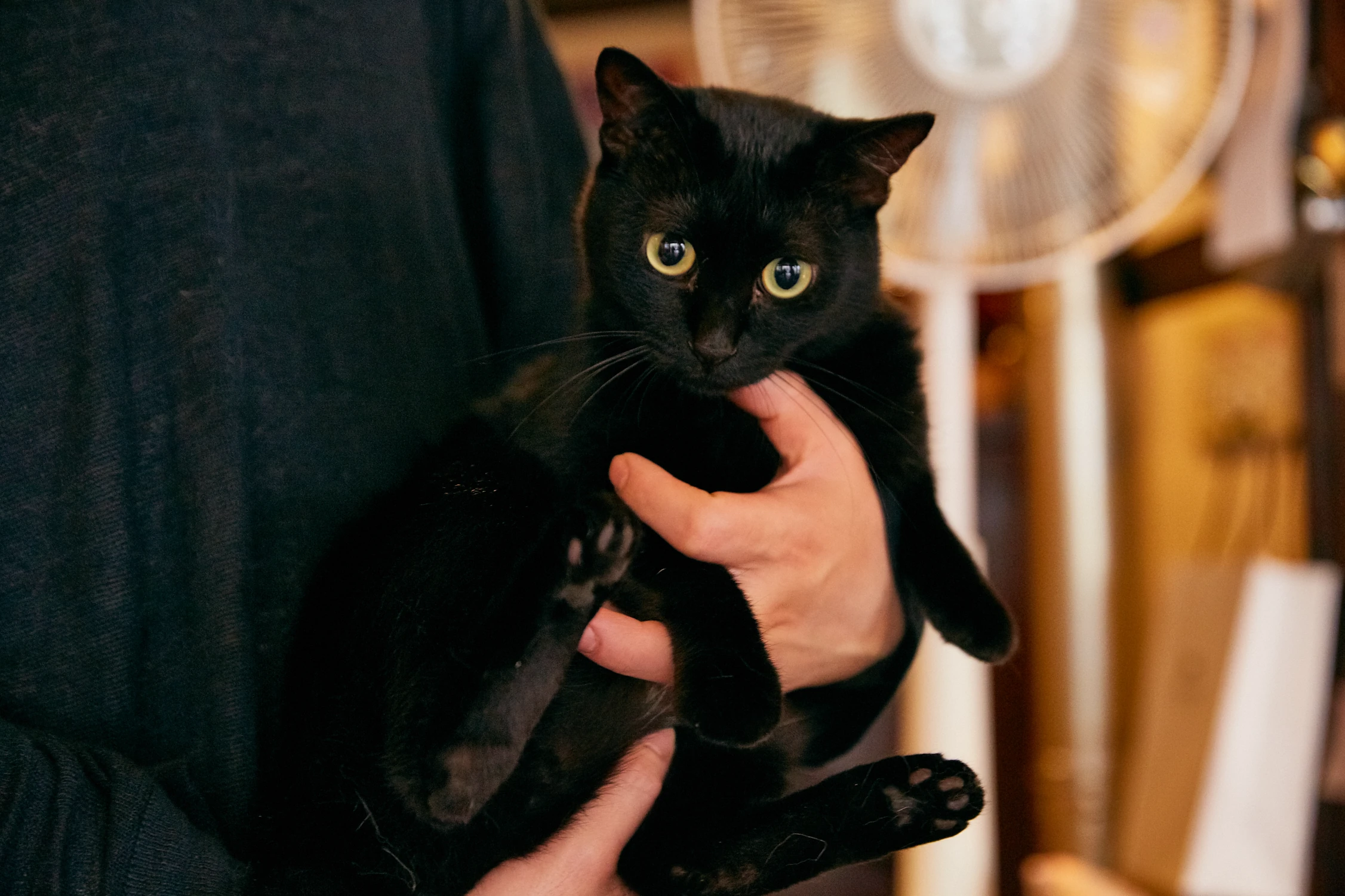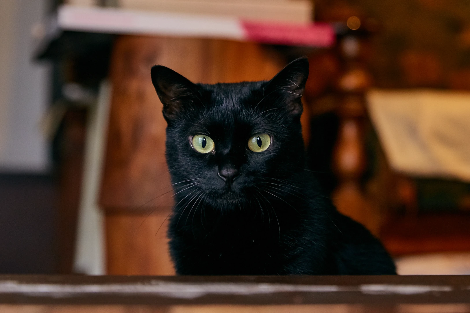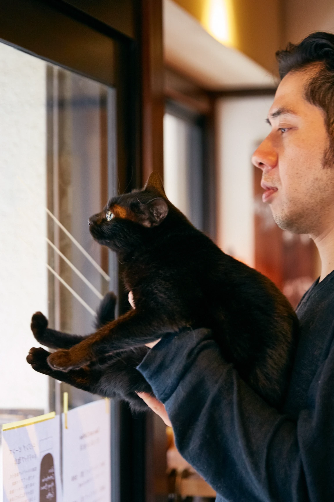 小学生たちを見つめるクロ。窓の外を眺めていることも多いそうで、マイペースながらもしっかり店番はしているようだ