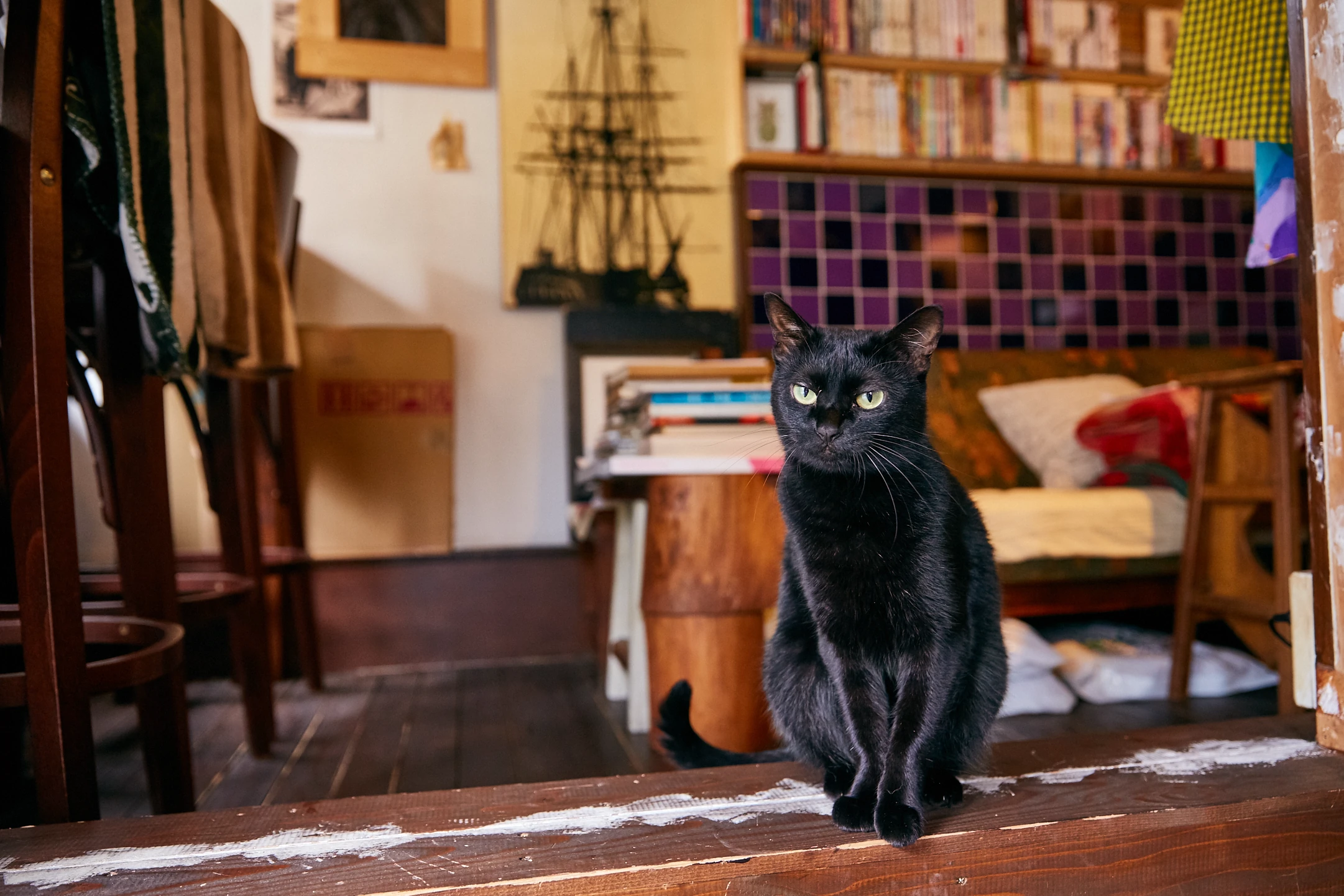 クロは、2歳ちょっとになるこの店の看板猫。実はもう一匹アオ(♀)という看板猫もおり、2匹は姉妹だ。店主の弦間友裕が友人の知り合いから譲り受けたという猫たちで、彼女たちは2年ほど前、名古屋からこの街にやってきた。