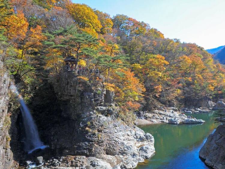 渓谷は「川治温泉」と「鬼怒川温泉」の間、およそ3キロメートルにわたって続き、自然の造形美を間近に感じられるスポットとして人気が高い。川治温泉側からは整備された遊歩道が延びており、約7キロメートルを3、4時間ほどで歩けるハイキングコースになっている。