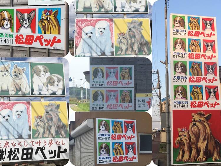 地元のペットショップの広告として知られる「例の看板」は、長岡市とその周辺に数百枚も存在する独特の風景。全て手描きで制作されており、同じ絵柄は一つとしてない。約20年前から少しずつデザインを変えながら新作が増え続けている点も、この看板のユニークな魅力だ。