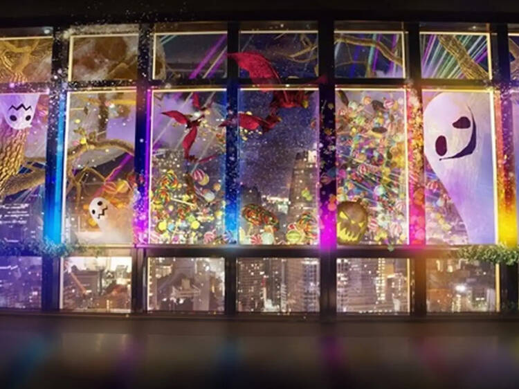 初めは、紅葉やススキが窓一面に広がり、静かな虫の音が心地よい秋の夜を演出。やがてポップな音楽とともにお化けや魔女、コウモリたちがハロウィンパーティーを盛り上げ、会場の雰囲気がガラッと変わるのもユニークだ。