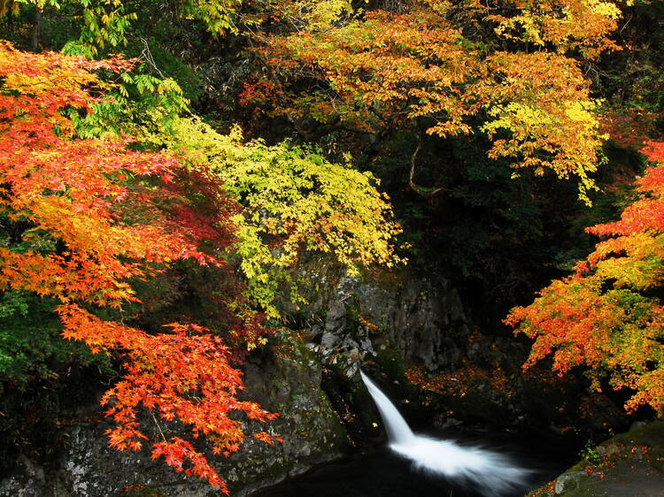 見どころは、川の両岸に生い茂るカエデ、クヌギ、アカマツなどが作り出す四季折々の風景。4月中旬から下旬にはミツバツツジが咲き誇り、5月上旬には鮮やかな新緑が渓谷を包む。そして11月上旬には、赤や黄の紅葉が渓谷を彩る。